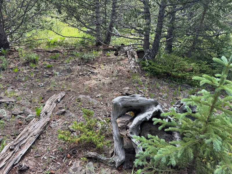 We hiked east up into the trees to the very broad and flat summit area and wandered around for a while looking for the highest point. We found a rock pile under a log and were satisfied that that must be it and returned to our trucks.