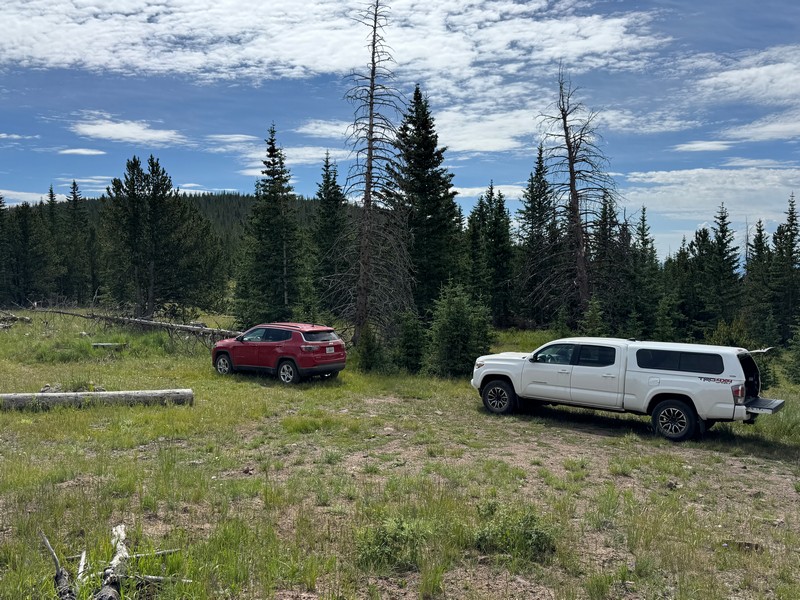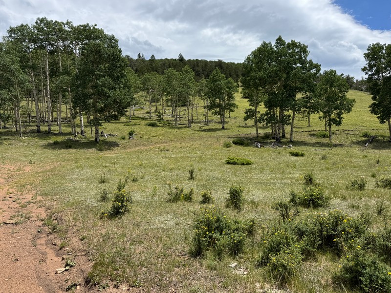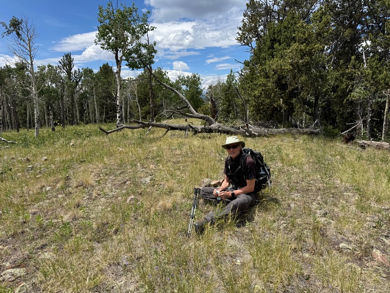 We returned to CR 12 and continued north to the vicinity of UN 10231. This peak is on a piece of public land that is surrounded by private land with no public access to the peak. After driving up and down the road for a bit and seeing some no trespassing signs we decided to just stop at a ranch house and ask the owner for permission to cross his land to the peak and the friendly fellow immediately agreed. We drove up a hill and parked on a private road on his property and headed up the slope to the east through some aspens.
