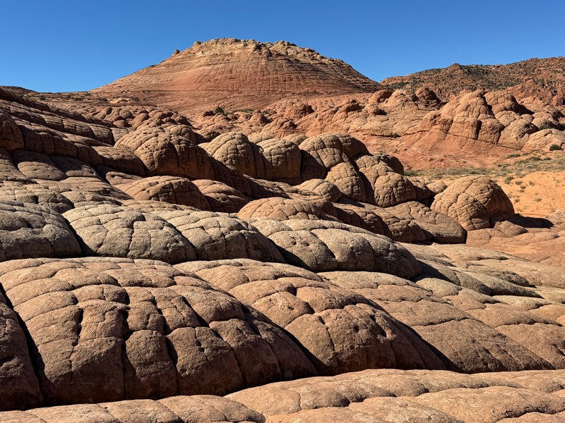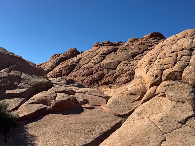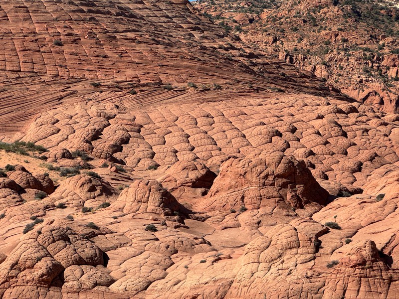 After a couple of miles we turned left and slogged through sand up a wide side wash. We followed footprints and soon climbed up out of the wash and into Edmaier’s Secret. This is a vast otherworldly playground of colorful slickrock domes, layers, brain rock, and other formations.