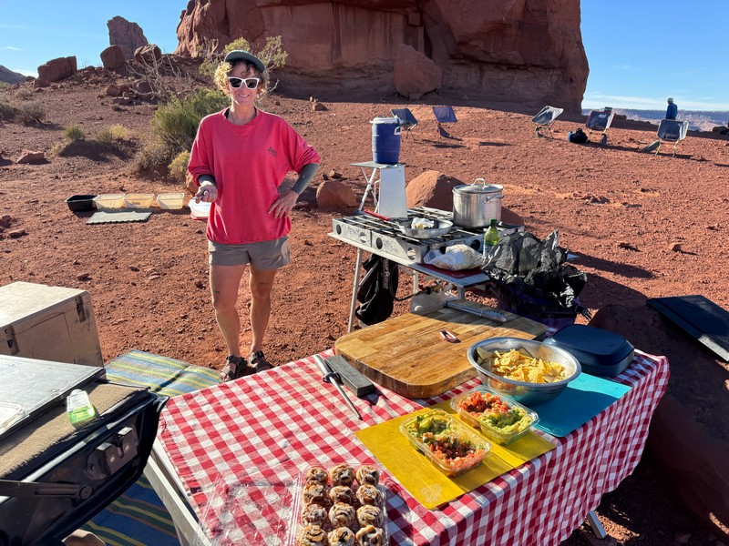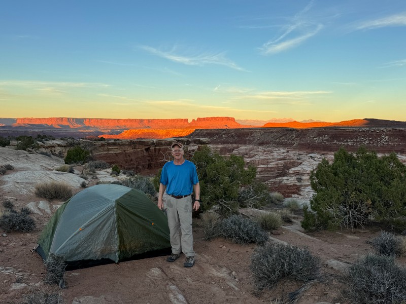 The standard Navtec Maze itinerary does not go to the Maze Overlook. Not only did we get to go there but also to camp right on the rim – a truly spectacular place to camp! There are only a handful of designated places to camp in the Maze area and Charlotte told us that reservations are hard to get for this one at the Maze Overlook. Our great guides prepared a wonderful dinner for us and we sat around and visited and wandered about admiring the grand scene spread out before us, taking numerous photos. The Maze is a twisting, turning labyrinth of canyons where it is easy to get lost. Tomorrow we would hike across it.