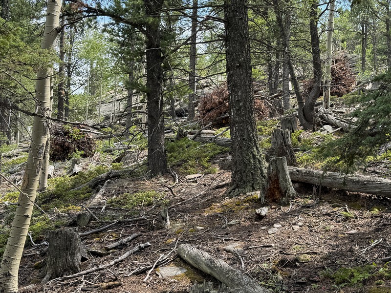 From the summit of Pulver we made a direct descent down toward our vehicles. On the lower slopes we came upon an area where forest thinning was taking place and took advantage of a faint trail the rest of the way down.